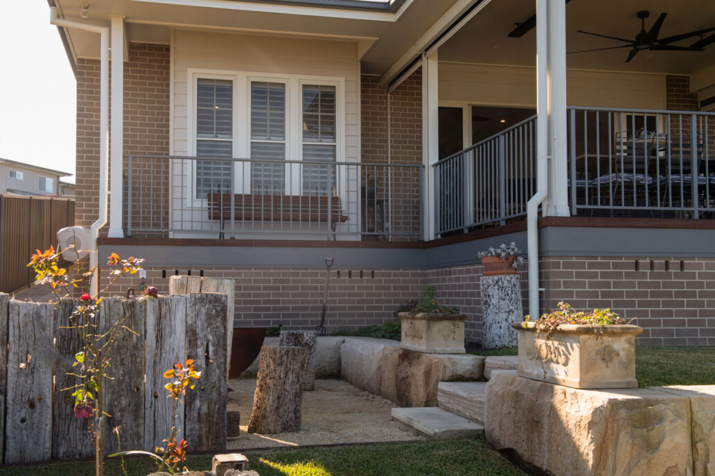 We’ve always loved having a garden so that we can have flowers in the house and fresh herbs for cooking. The rusty metal edging, recycled timber posts and sleepers, as well as the sandstone were chosen to give a rustic feel to the outdoor space, and to continue the theme from inside. The stonework around our fireplace and the recycled railway sleeper that is our mantle were part of the inspiration for the landscaping choices.