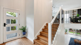 Upon entering through the Sterling Doors timber and wrought iron front door, a striking wrought iron pendant light welcomes you into a functional, light filled design split across 3 levels. The home offers a home office with built in oak timber cabinetry, a stunning custom kitchen with butler’s pantry, open plan dining and living with gas fireplace and balcony flowing through to a master bedroom with a large walk in robe and ensuite featuring matte black bathroom accessories and a custom vanity.